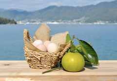 島で採れた「青みかん」「海藻」「自家製塩」の他、「米ぬか」「魚粉」「牡蠣殻」「野菜や野草」を飼料にして配合して与えています。黄身の色を濃くするための着色用の餌は入っていませんが、柑橘のような濃い橙色をしています。