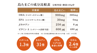 島たまごからは優れた成分が確認されています。島たまごは一般玉子と比べると『ビタミンA 1.3倍』『Bカロテン31倍』『EPAマグロの赤身と同等』『DHA2.4倍 サバと同等』などなど美味しいだけじゃなく、おいしく健康にを実現できる玉子です。